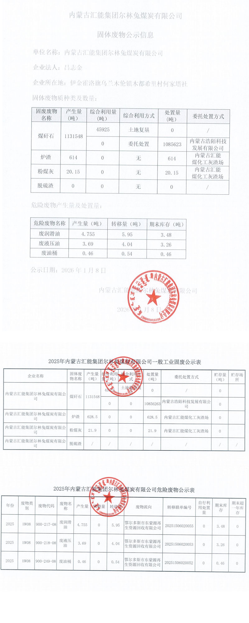 内蒙古汇能集团尔林兔煤炭有限公司 固体废物公示信息