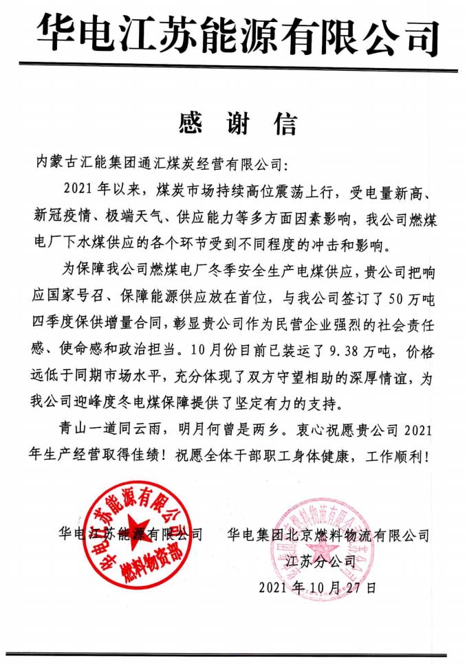 华电江苏能源有限公司、华电集团北京燃料公司给汇能集团的感谢信