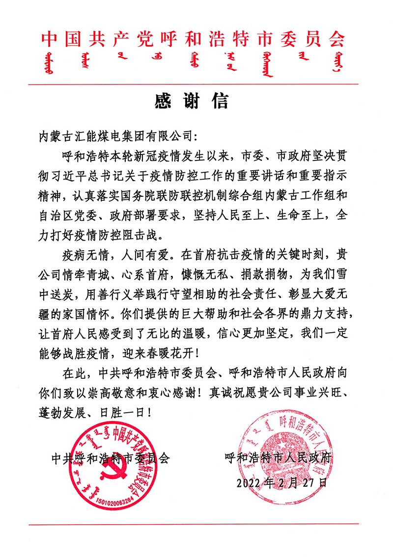 一封来自中共呼和浩特市委员会、呼和浩特市人民政府的感谢信