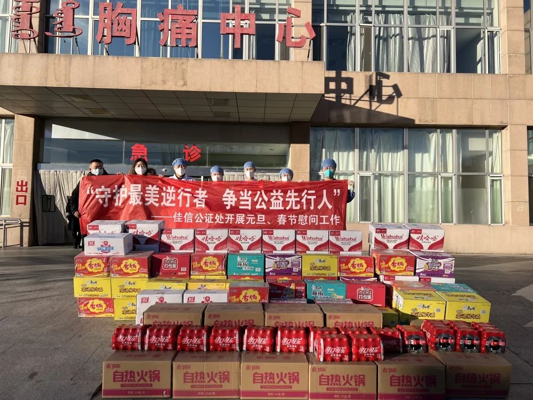 12月28日下午,佳信公证处郝凤霞主任一行为我院东胜部急诊科一线医务人员送来方便食品,助力疫情防控工作。